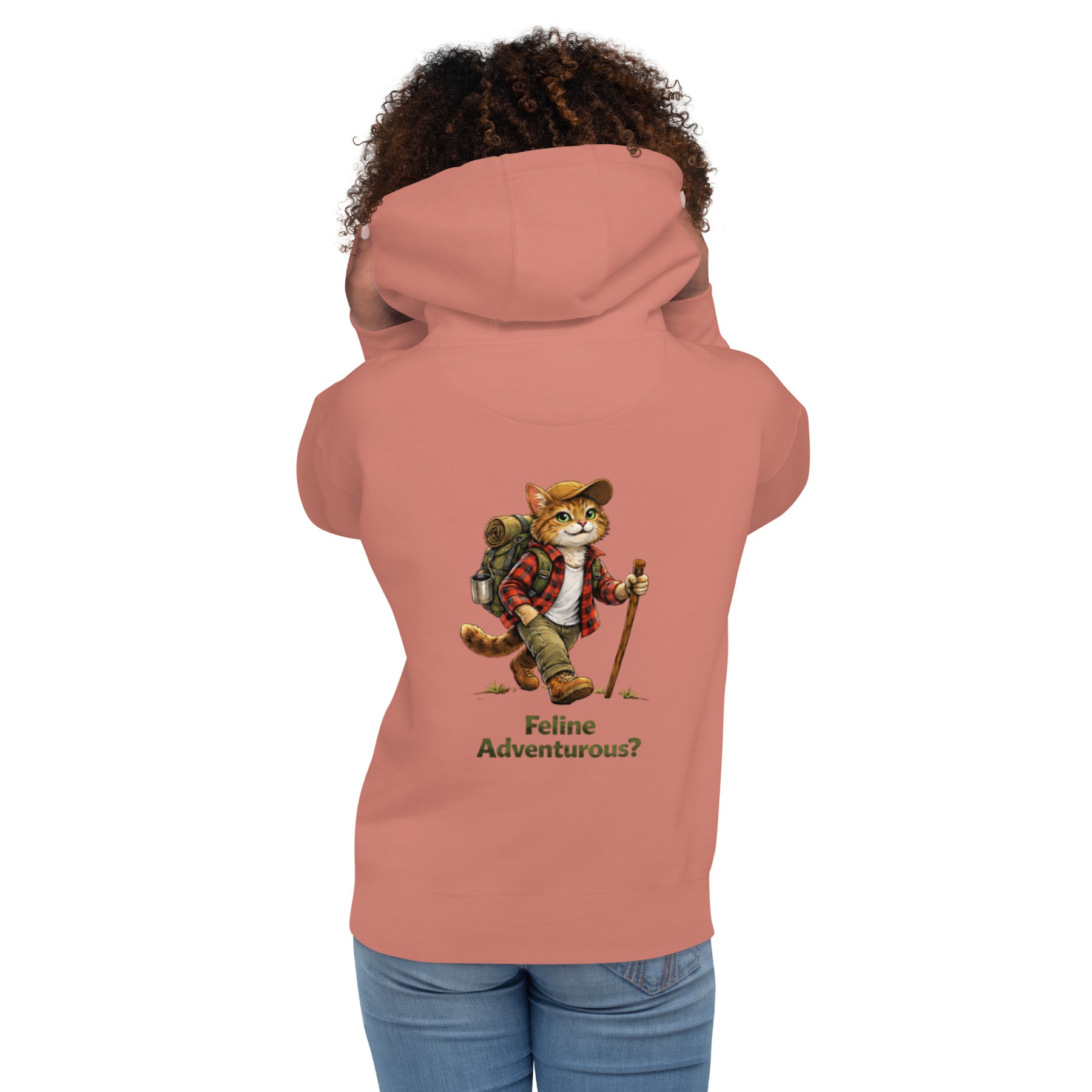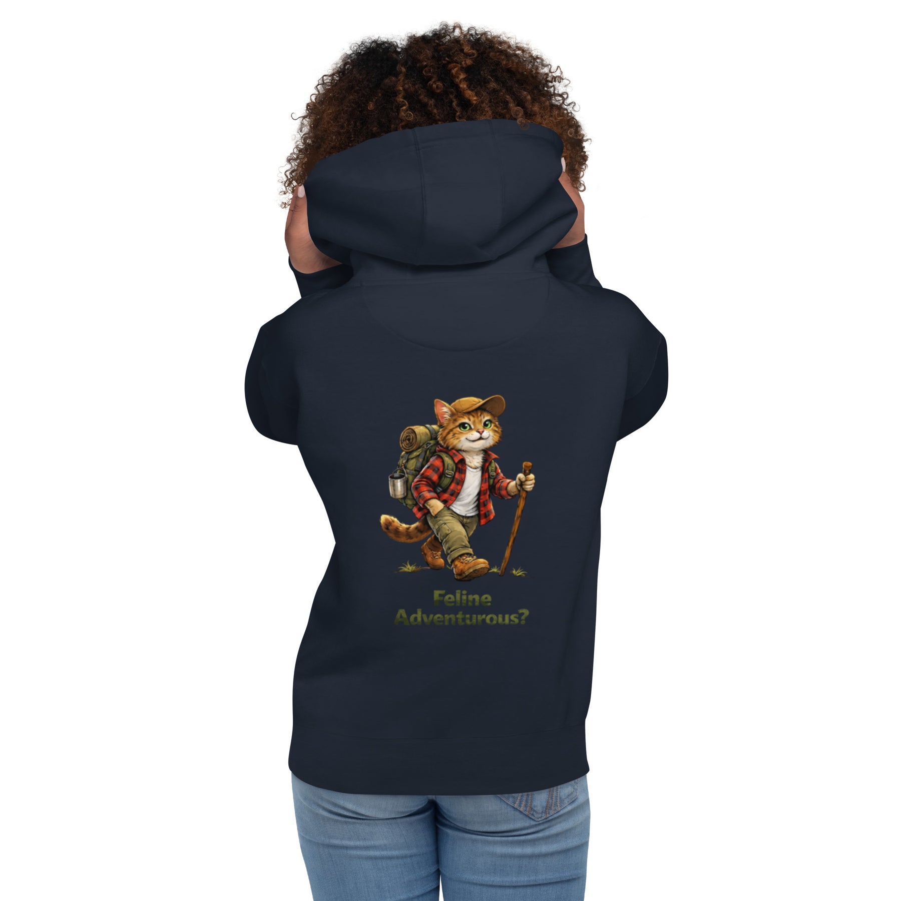 The Feline Adventurous? Hoodie features a confident hiking cat geared up for the trail—backpack, boots, and all. Perfect for cat lovers who crave fresh air, dirt paths, and a little humor along the way, this hoodie blends cozy comfort with outdoorsy charm.
